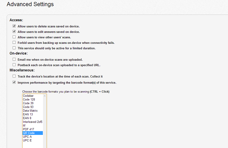 Note: The Advanced Option “Improve performance by targeting the barcode format(s) of this service” improves the functionality of the scanning engine on your device. If you are unsure of the name of the barcode type you plan to use: Go to the ‘SD PRO – Try It’ option on the app’s sign-in page as it will identify the barcode symbology after each scan.